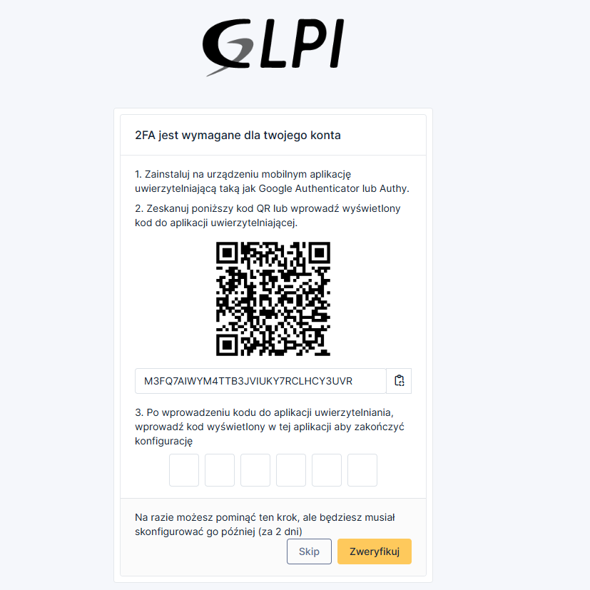 GLPI 11.0 oferuje udoskonalone uwierzytelnianie dwuskładnikowe (2FA) oparte o TOTP, z możliwością globalnego wymuszania, na poziomie profili, grup lub indywidualnych użytkowników, co znacząco podnosi bezpieczeństwo dostępu. Wbudowany serwer OAuth umożliwia bezpieczniejszą integrację z API GLPI, ułatwiając zarządzanie dostępem aplikacji zewnętrznych do danych.